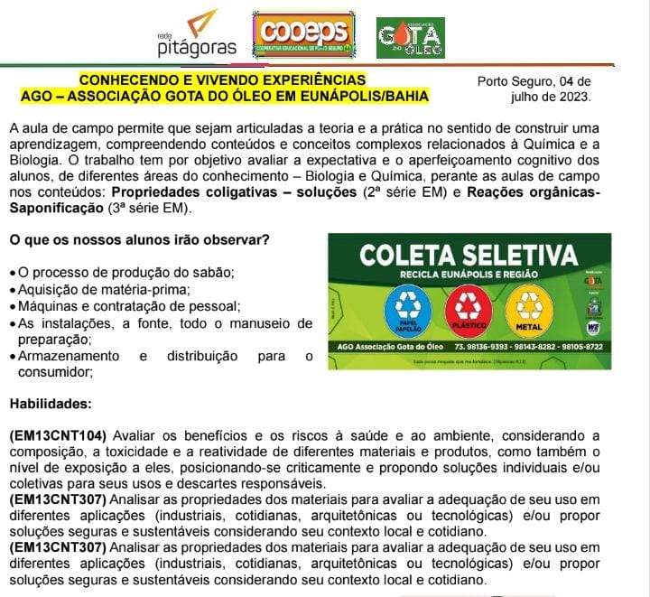 Na manhã desta segunda-feira, 10 de julho de 2023, os alunos/as da 2ª e 3ª série do EM, disciplinas de Química e Biologia da Cooperativa Educacional de Porto Seguro – COOEPS acompanhados dos professores Teide e Raquel realizaram visita técnica na Sede da AGO – Associação Gota do Óleo em Eunápolis.