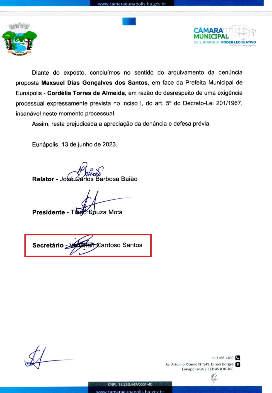 Vereador Valterlan assinou em nome errado, para arquivar denúncia contra prefeita.