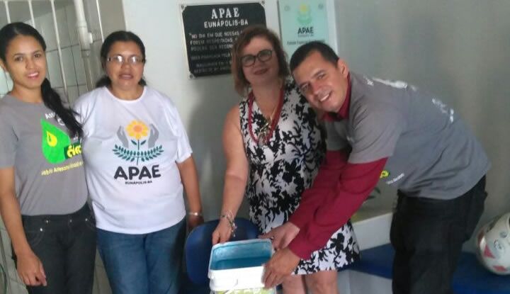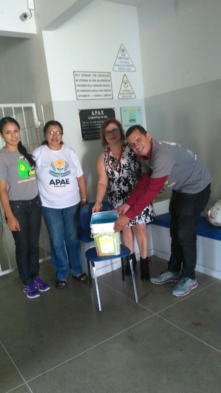 Associação Gota do Óleo destina parte da sua produção para entidades sem fins lucrativos. Emília Maria Machado Loureiro, presidente da APAE Eunápolis recebeu nesta sexta-feira, 9 de junho de 2017, a doação de 20 litros de Sabão Artesanal Ecológico Aruba em pasta. José Carlos Filho e Gercilane Santos, ambos da Associação Gota do Óleo informaram que este sabão pode ser utilizado para todo tipo de limpeza. Mensalmente a Associação Gota do Óleo estará visitando a APAE Eunápolis e fazendo a doação do sabão.