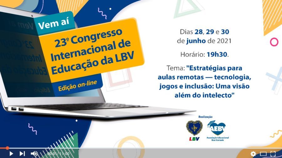 De 28 a 30 de junho, professores e educadores vão apresentar estratégias educacionais e práticas pedagógicas como contribuição à educação brasileira e internacional durante a edição on-line do 23º Congresso Internacional de Educação da LBV, sob o tema “Estratégias para aulas remotas — tecnologia, jogos e inclusão: uma visão além do intelecto”.