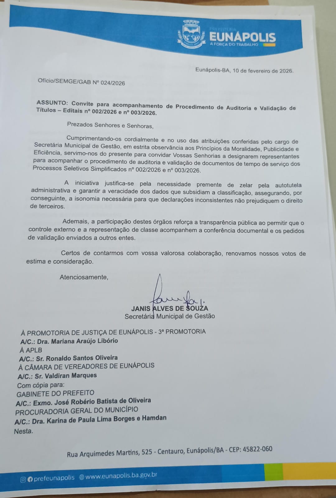 No dia 10 de fevereiro de 2026, a Prefeitura, por meio da Secretaria Municipal de Gestão, chefiada por Janis Alves de Souza, emitiu o Ofício/SEMGE/GAB nº 024/2026, convidando a 3ª Promotoria de Justiça de Eunápolis (Dra. Mariana Araújo Libório), a APLB (Sr. Ronaldo Santos Oliveira) e a Câmara de Vereadores (Sr. Valdiran Marques) a indicarem representantes para acompanhar o “procedimento de auditoria e validação” de documentos e tempo de serviço dos Processos Seletivos Simplificados nº 002/2026 e nº 003/2026. O texto afirma que a medida busca garantir veracidade, isonomia e transparência, com cópia ao Gabinete do Prefeito Robério Oliveira e à Procuradoria Geral do Município.