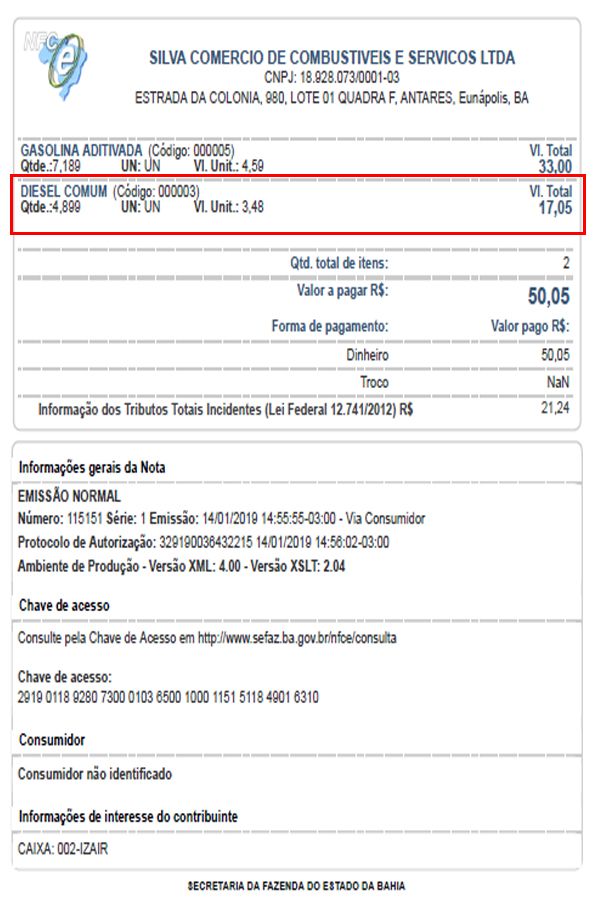 Veja abaixo cupom fiscal de abastecimento feito com DIESEL.