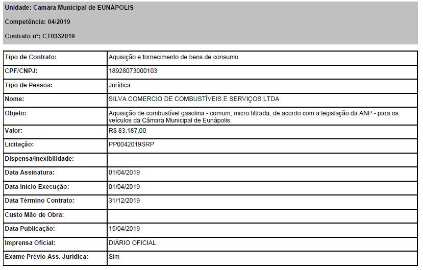 A câmara municipal de Eunápolis fechou contrato de Número: CT0332019, com validade a partir do dia 01/04/2019 à 31/12/2019, com valor total de R$ 87.087,00 com o posto de combustível SILVA COMERCIO DE COMBUSTÍVEIS E SERVIÇOS LTDA, CNPJ: 18.928.073/0001-03, para fornecimento de gasolina para os veículos da câmara que conforme documentos encaminhada ao posto, seria eles Placa: OZl-O502 FIAT Siena Attractív, 1.4, ano 2014, mod 2014, FLEX e 5 ONIX, Placas: QRE-6I67, QRE-6I76, QRE-6I40, QRE-6I87, todos esses veículos citado utilizam gasolina ou etanol.