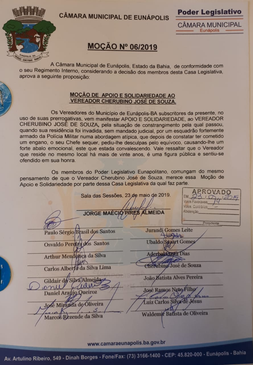 Os vereadores de Eunápolis aprovaram, na quinta-feira (23/05), Moção de Apoio e Solidariedade ao colega Cherubino José de Souza (PTB) “pela situação de constrangimento pela qual passou, quando sua residência foi invadida, sem mandado judicial, por um esquadrão fortemente armado da Polícia Militar da Bahia, numa abordagem considerada atípica”, conforme o documento emitido pela Casa Legislativa.