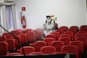 A desinfecção e higienização de paredes, pisos, instalações e equipamentos foi aplicado no plenário, nas salas de reuniões, gabinetes dos vereadores, corredores, garagens e nos acessos internos e externos do prédio.