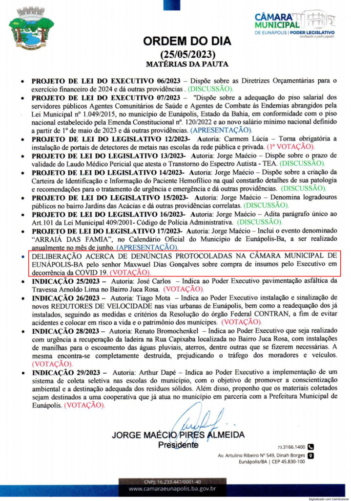 A cidade de Eunápolis, teve centenas de eunapolitanos que perderam a vida em razão do COVID, cabe também a Câmara de vereadores investigar, analisando documentos apresentados e outros que serão juntados se a denúncia for aceita pelos vereadores.