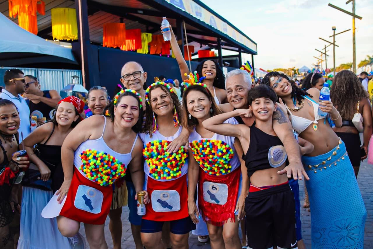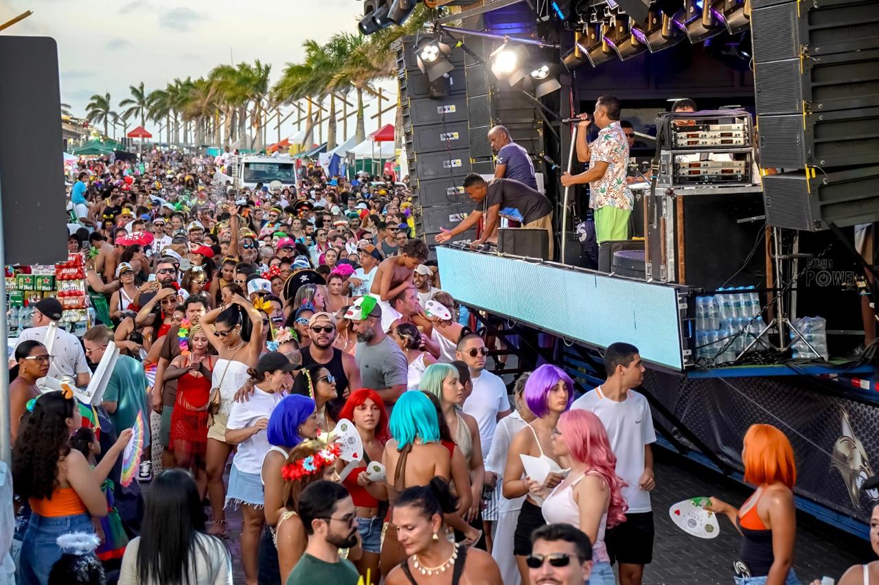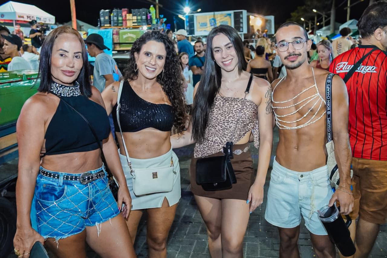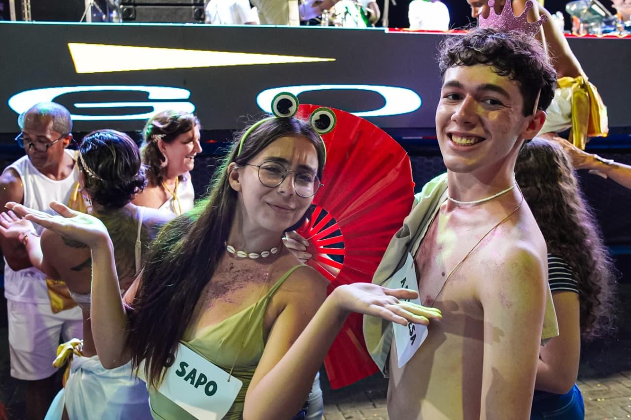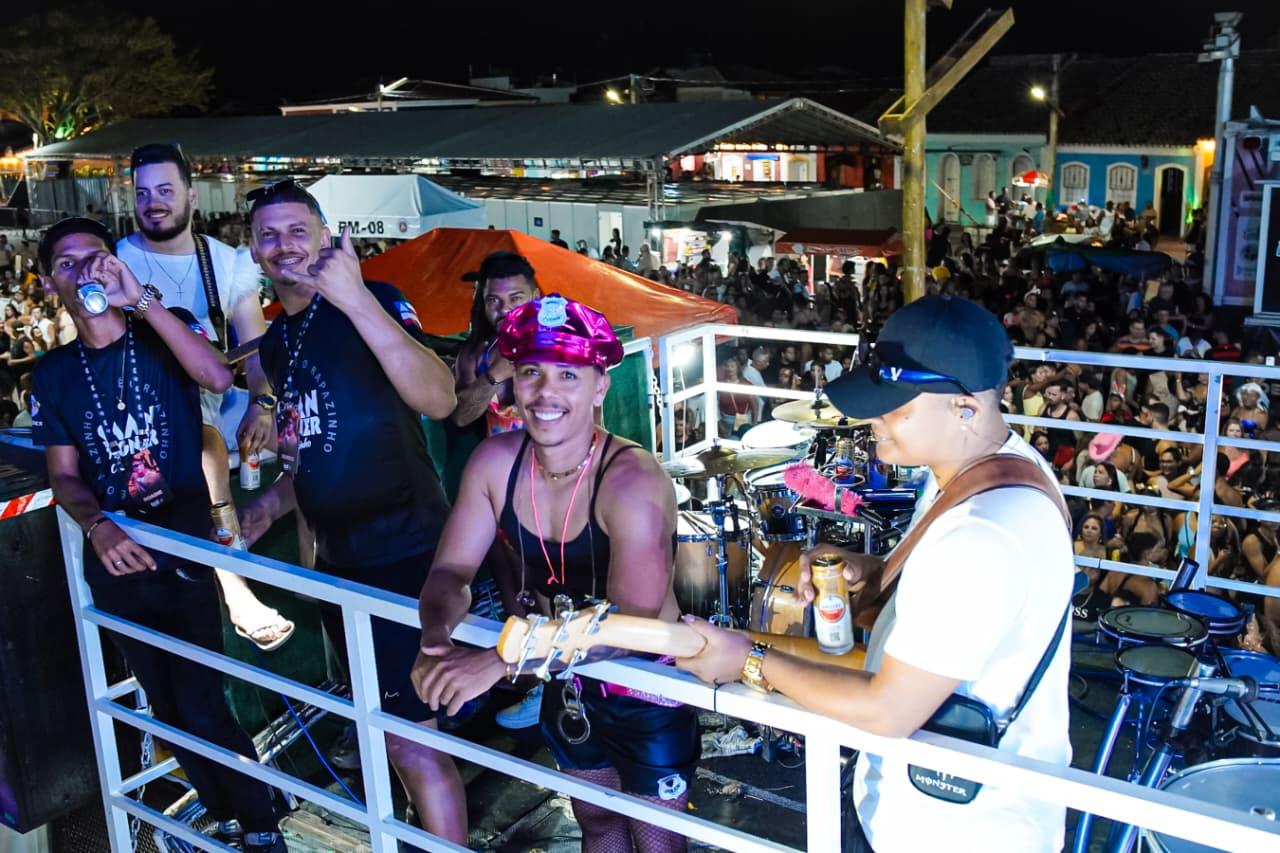 Só que o enredo mais mágico do dia começou cedo com o tradicional Bloquinho: o momento em que a fantasia não é roupa, é autorização. É quando o adulto vira criança, o tímido vira coreógrafo, e até o mais sério descobre que tem, sim, uma vocação secreta pra marchinha, sambinha, pagode e axé, tudo junto, tudo misturado, do jeitinho que a alegria gosta. Da concentração no píer pra rua, foi uma multidão desfilando imaginação como se fosse confete, tinha brilho, tinha personagem, tinha “criatura da noite” ao sol das 14h e tinha aquele amigo que some e reaparece com outra fantasia, como se tivesse um camarim portátil e um pacto com o Carnaval. E junto com essa maratona gostosa, também foi dia de As Barguncetes, puxando a “baguncinha boa”, e dois blocos Bora Mais Eu e o Pajubá.