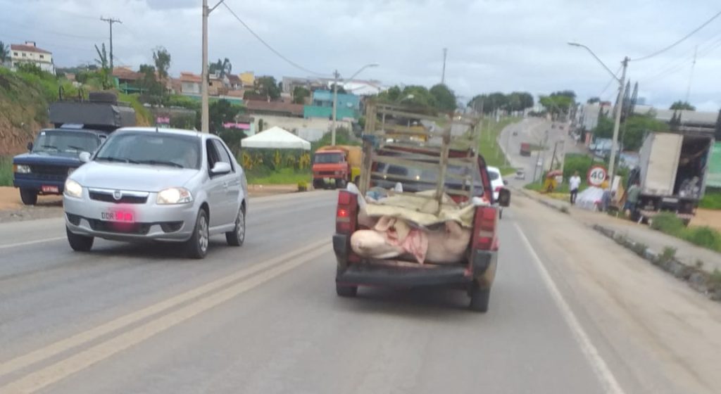 Na tarde desta sexta-feira (17), o Portal Sul Bahia flagrou na Br 101, em Eunápolis um veículo transportando um porco abatido e esquartejado, sem os devidos acondicionamentos para o transporte (higiene e refrigeração), tornando a carne inadequada para o consumo humano.