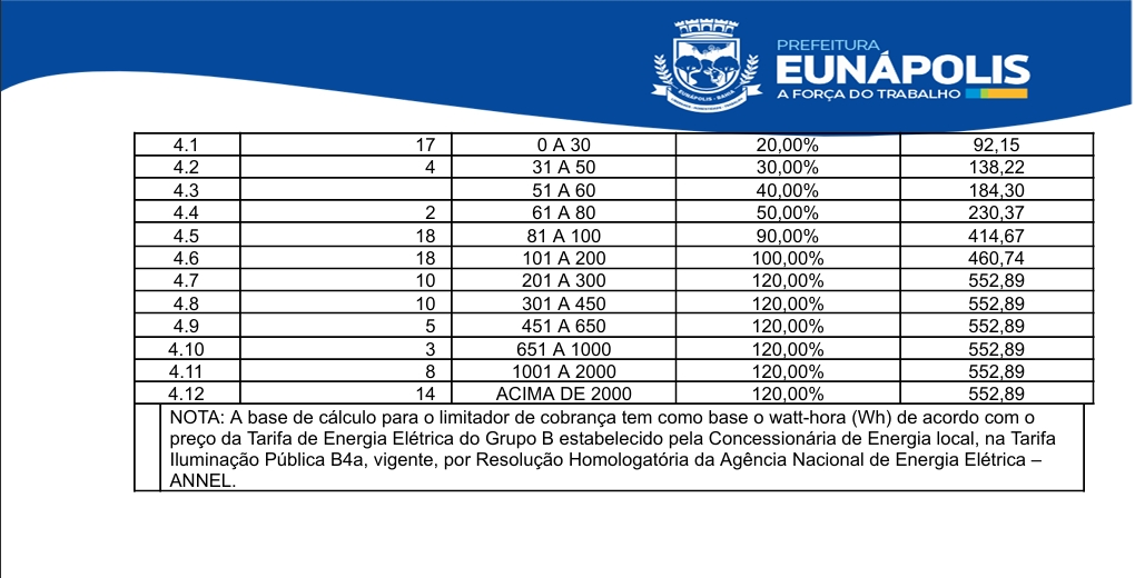 O impacto mais expressivo ocorre na classificação industrial. Mantendo os mesmos 258 kWh, a proposta autoriza percentual de 120% sobre a Tarifa B4a, o que eleva a COSIP para até R$ 552,89. Nesse cenário, a taxa de iluminação pública passa a superar com folga o valor da própria energia consumida, evidenciando que a mudança proposta transfere o peso da cobrança para o enquadramento do consumidor, e não para o consumo real.