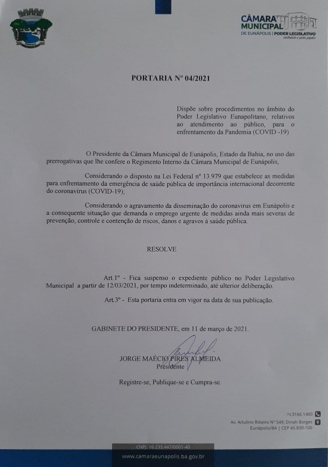 Em função dos impactos da pandemia do Coronavírus (Covid-19), o presidente da Câmara Municipal de Eunápolis, Jorge Maécio (PP), decidiu por meio da Portaria número 04/2021, adotar medidas para mitigação de riscos da doença no âmbito da Casa, suspendendo o expediente de atendimento ao público a partir desta sexta-feira, 12/03 por tempo indeterminado, até nova deliberação.