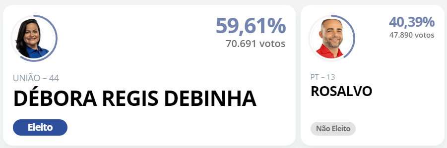A vereadora Débora Régis (UB) foi eleita prefeita de Lauro de Freitas, a candidata obteve 70.691 votos e derrotou o candidato do PT, Rosalvo que teve 47.890 votos.