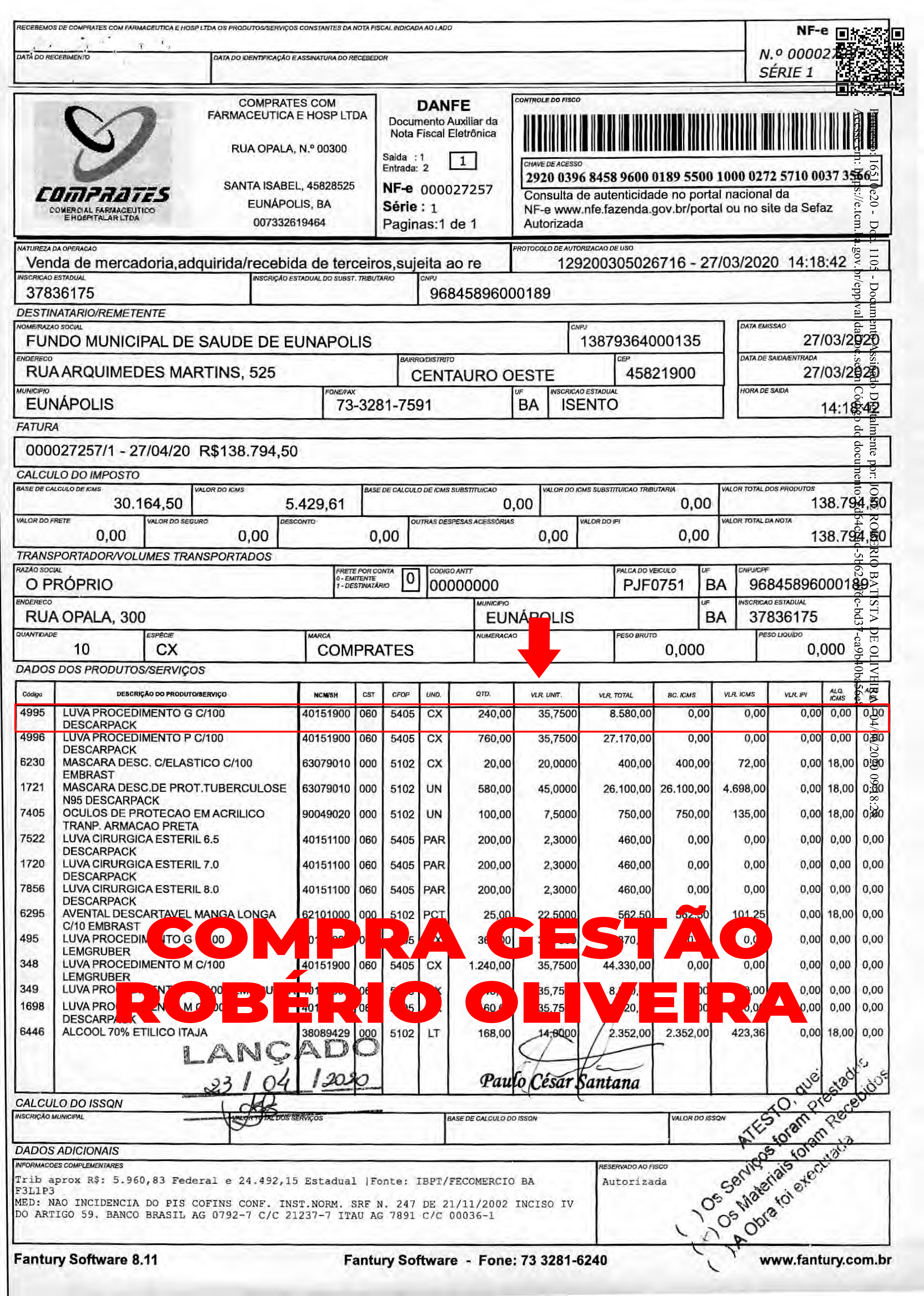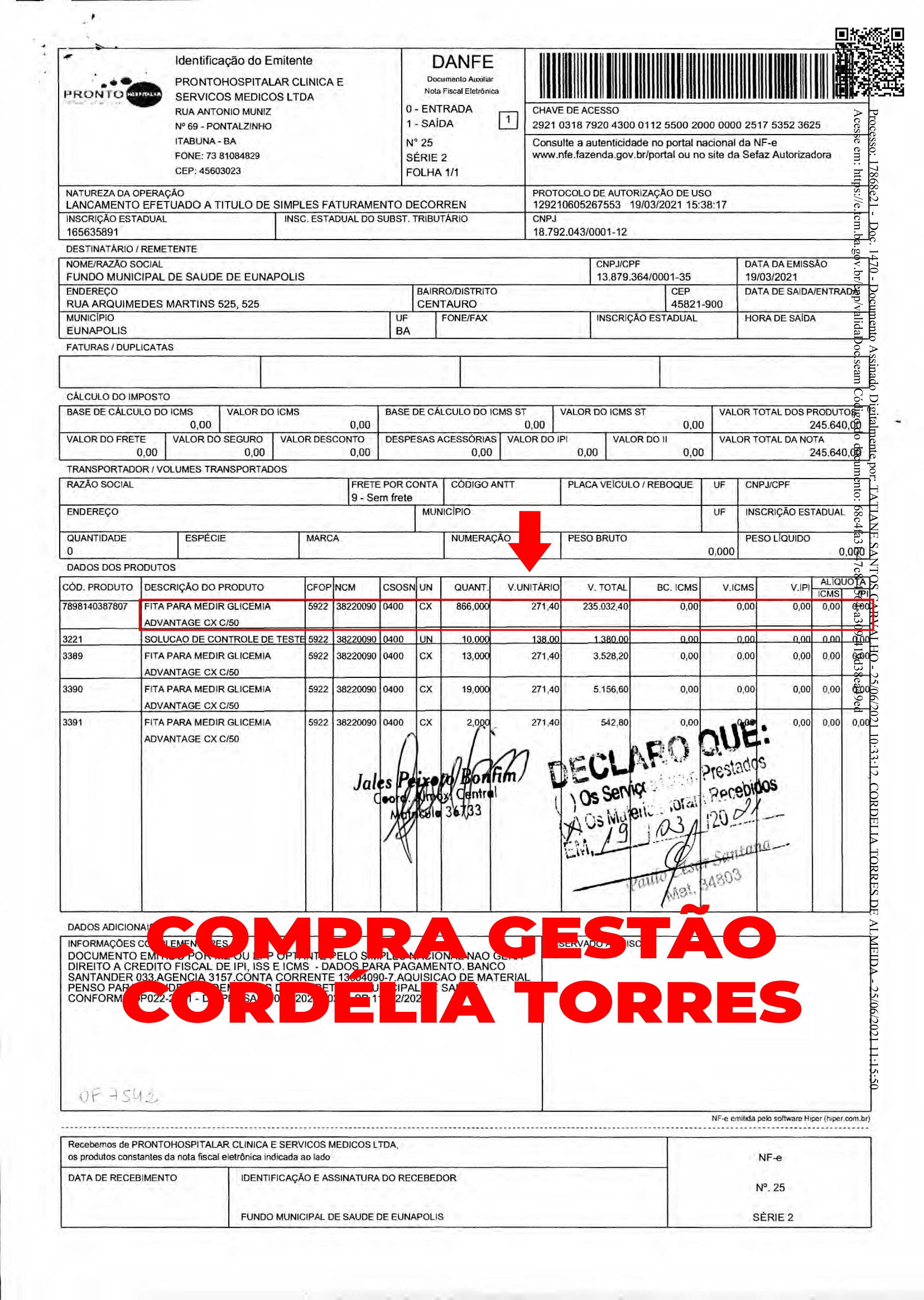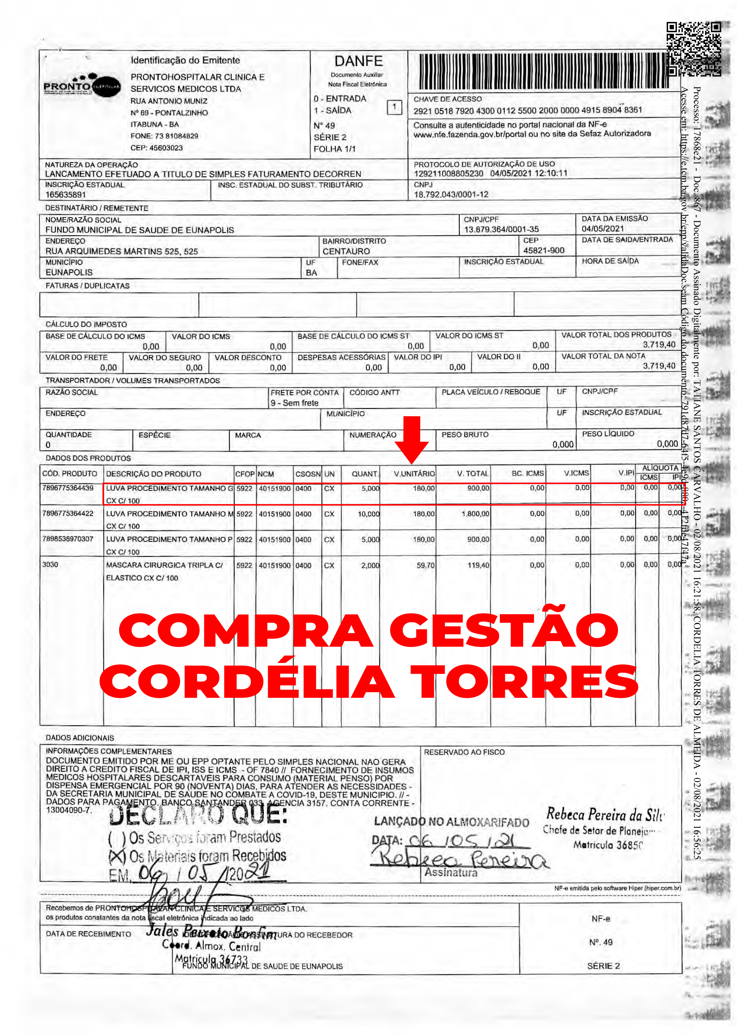 Às duas primeiras notas fiscais, foram de compras de insumos para atender a Secretaria de Saúde no ano de 2020, comprado na gestão do ex-prefeito Robério Oliveira, as outras duas notas fazem parte da compra realizada pela prefeitura em 2021, na gestão da prefeita Cordélia Torres.