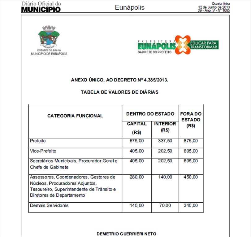 O Decreto Nº 4.385/2013 estabelecia os valores conforme mostrado abaixo na primeira tabela, já a segunda tabela refere-se ao Decreto em vigor publicado por Robério Oliveira, todas as diárias para de 20% de aumento se comparado ao Decreto anterior.