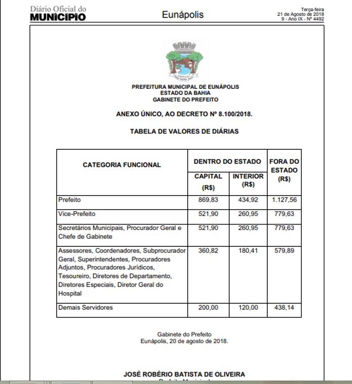 O novo Decreto publicado pelo prefeito Robério, alterou os valores de todas às diárias de funcionários da administração pública municipal.