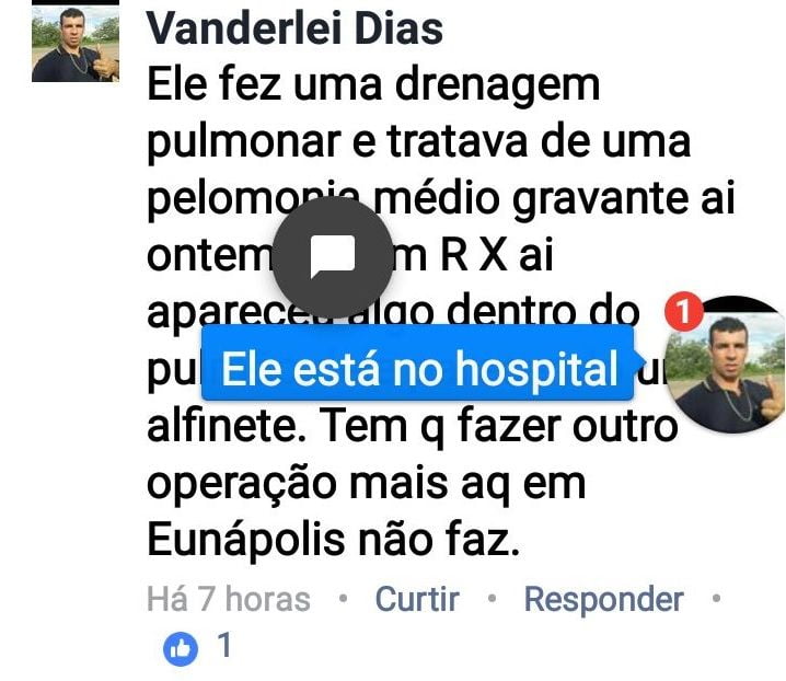 Patrícia procurou a imprensa e relatou (áudio) todo o acontecimento descrito e disse ainda que vai levar o caso ao conhecimento do Ministério Público.Ela está indignada com a Tomografia e raios X que antes da cirurgia apresentaram água e líquidos no pulmão e não revelou nenhum indício de agulha e quer explicações do porque após cirurgia apareceu justo no órgão doente algo que aparenta ser uma agulha e o Hospital chamando de alfinete, alega que o corpo estranho já estaria no corpo do seu irmão. Segundo Patrícia, a direção do Hospital está buscando uma vaga para transferir o paciente, alegando que a cirurgia para retirar o corpo estranho não pode ser feita no Regional.