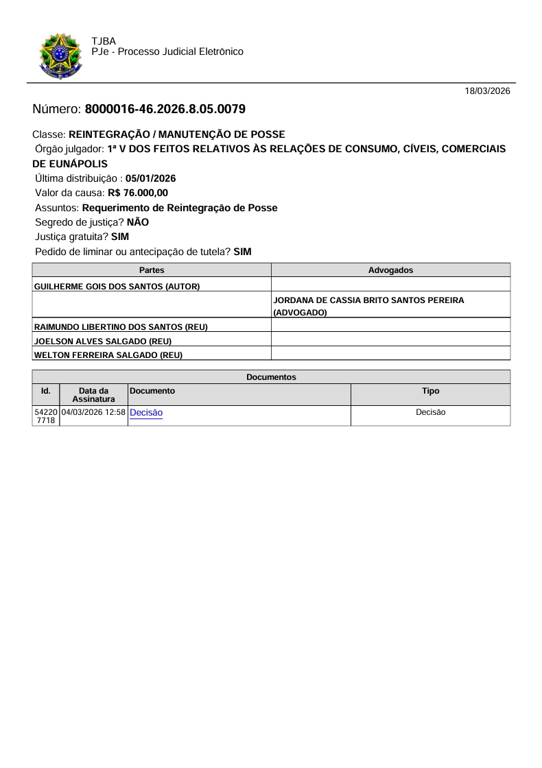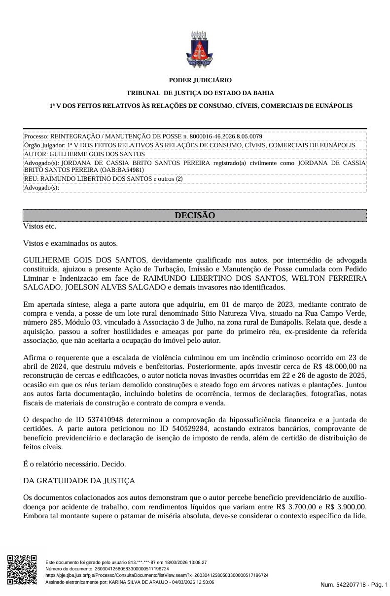 A Justiça determinou a reintegração e manutenção de posse do Sítio Natureza Viva, localizado na Rua Campo Verde, nº 285, Módulo 03, no Assentamento 3 de Julho, zona rural de Eunápolis. A decisão, assinada pela juíza Karina Silva de Araújo, da 1ª Vara Cível de Eunápolis, beneficia Guilherme Góis dos Santos, autor da ação, e tem como réus Raimundo Libertino dos Santos, Welton Ferreira Salgado, Joelson Alves Salgado e demais invasores não identificados.