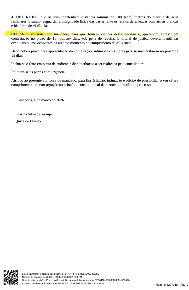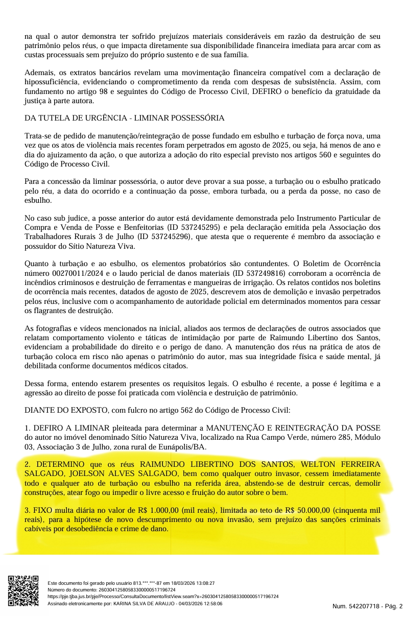 Ao analisar o caso, a magistrada entendeu que havia elementos suficientes para conceder a liminar, apontando posse anterior demonstrada, esbulho recente e agressão ao direito de posse com violência e destruição de patrimônio. A decisão determinou que os réus parem imediatamente qualquer ato de turbação ou esbulho na área, ficando proibidos de destruir cercas, demolir construções, atear fogo ou impedir o livre acesso do autor ao imóvel. Em caso de descumprimento ou nova invasão, foi fixada multa diária de R$ 1 mil, limitada a R$ 50 mil, além de possíveis sanções criminais por desobediência e crime de dano. A juíza também determinou distância mínima de 100 metros entre os réus, o autor e seus familiares.