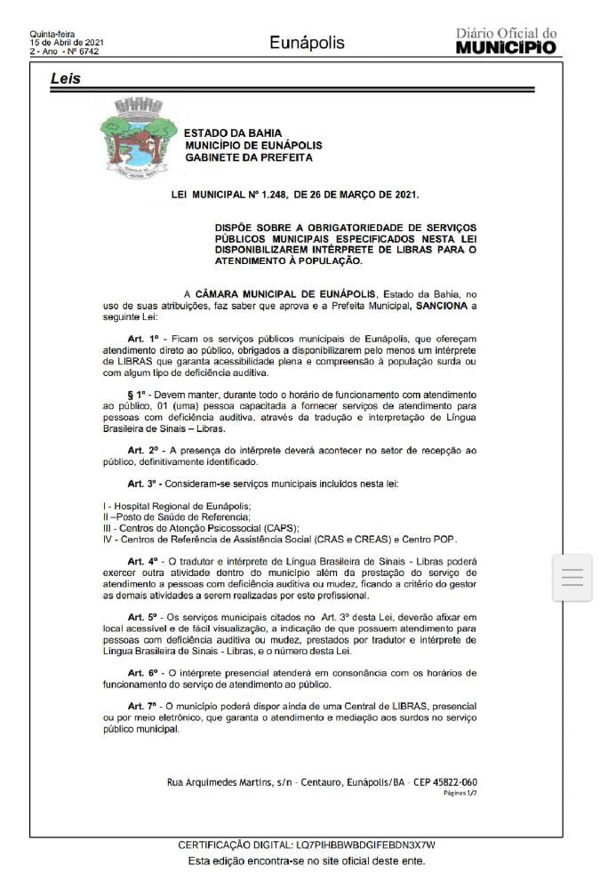 O Artigo Art. 1º – Ficam os serviços públicos municipais de Eunápolis, que ofereçam atendimento direto ao público, obrigados a disponibilizarem pelo menos um intérprete