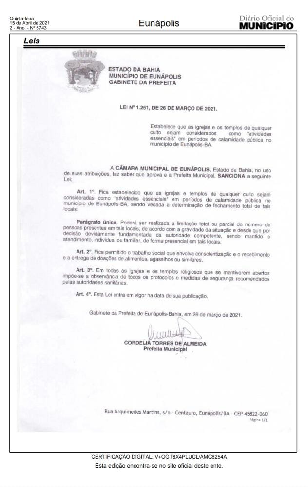 Já a Lei 1.251, estabelece que as e os templos de qualquer culto sejam considerados como “atividades essenciais”, em período de calamidade pública no município de Eunápolis.