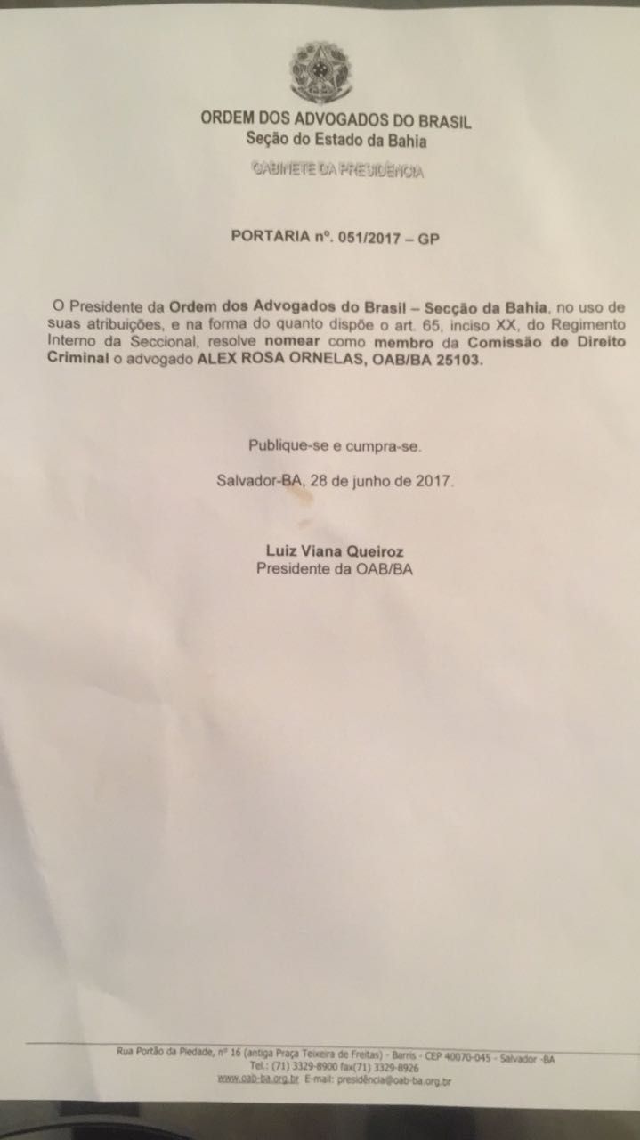 No dia 29/06 (quinta-feira), foi publicada no Diário Oficial – DJ Bahia a designação do advogado Alex Ornelas para compor a Comissão de Direito Criminal da Seccional baiana.
