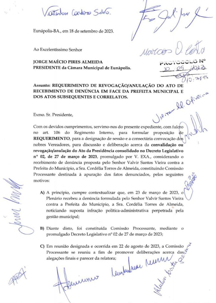 VEJA ABAIXO REQUERIMENTO ASSINADO PELOS DEZ VEREADORES: