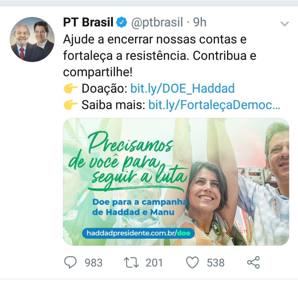 O PT – Partido dos Trabalhadores estar pedindo dinheiro em sua conta oficial no Twitter, para quitar dívida da campanha Haddad e Manuela, será que os 47 milhões de eleitores do candidato derrotado Fernando Haddad vai atender a solicitação do PT e fazer doação?