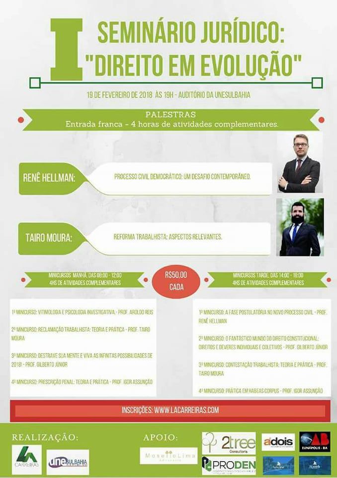 O I Seminário Jurídico “Direito em Evolução”, na formação do evento, terá inúmeras palestras/minicursos com relevantes temas na área jurídica.