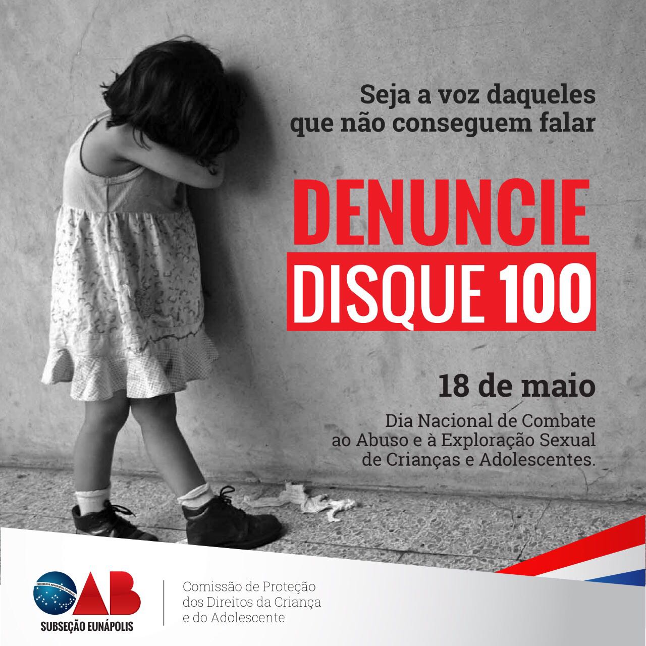 A Comissão de Proteção dos Direitos da Criança e do Adolescente da OAB – Subseção Eunápolis realiza programação, durante o dia 18 de maio, em alusão ao Dia Nacional de Combate à Exploração Sexual de Crianças e Adolescentes.