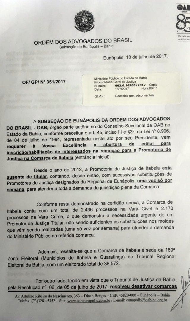 OAB – Subseção Eunápolis solicita designação de promotores titulares para as comarcas de Itabela e Guaratinga