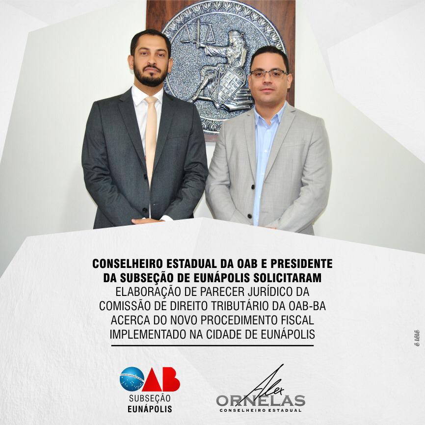 O Presidente da OAB/Eunápolis (Leonardo Maia) e o Conselheiro Estadual da OAB/BA (Alex Ornelas), tendo em vista os diversos questionamentos acerca do novo procedimento fiscal,