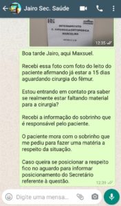 Entremos em contato com o Secretário de Saúde, Jairo Junior, para ouvi-lo sobre a falta de materiais relatados pelo sobrinho do paciente, mas apesar de ter visualizado nossa mensagem, não respondeu. Demonstrando um falta de interesse em prestar informações à sociedade que buscam resolver problemas de saúde, mas o silêncio parece ser realmente à resposta por quem deveria prestar informação à sociedade.