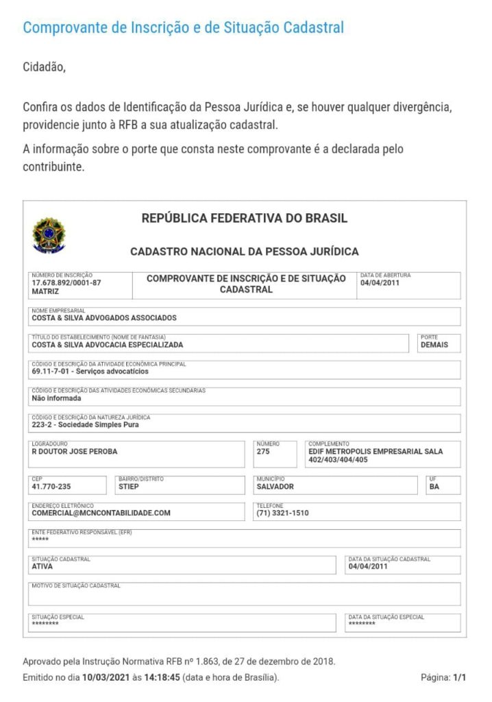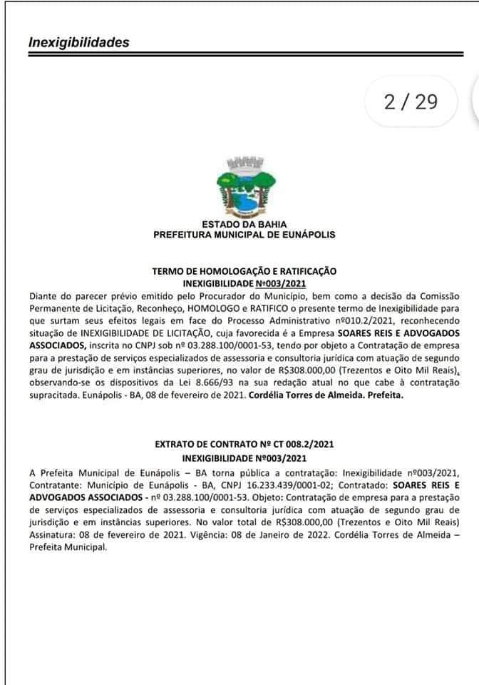 A prefeita de Eunápolis, Cordélia Torres, contrata mais um escritório de advocacia da capital, desta vez o escritório contratado foi COSTA & SILVA ADVOGADOS ASSOCIADOS, inscrita no CNPJ sob nº17.678.892/0001-87, tendo por objeto contratação prestação de serviço técnico especializado de assessoria e consultoria jurídica na área previdenciária, trabalhista, ambiental e ordenamento do uso do solo no valor de R$ 32.000,00 (trinta e dois mil reais).