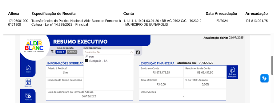Desde o dia 1º de março de 2024, a Prefeitura de Eunápolis tem em conta o valor de R$ 875.479,25, referente aos recursos enviados pelo Ministério da Cultura por meio da Política Nacional Aldir Blanc. Do total, R$ 813.021,75 foram repassados originalmente pelo Governo Federal, e R$ 62.457,50 correspondem aos rendimentos da aplicação financeira. No entanto, até o momento, nenhum valor foi repassado aos artistas locais. A ex-prefeita Cordélia Torres não deu andamento à execução da política, e seis meses após a posse do atual prefeito José Robério Oliveira, a omissão persiste.