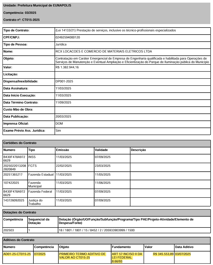 A Prefeitura de Eunápolis publicou, no Diário Oficial do Município de 26 de setembro de 2025, o extrato do segundo termo aditivo ao Contrato nº 015/2025, firmado com a empresa RCX Locações e Comércio de Materiais Elétricos EIRELI. O documento, assinado pelo prefeito José Robério Oliveira, prorrogou a vigência do contrato para o período de 11 de setembro de 2025 a 11 de março de 2026, no valor de R$ 1.382.944,16, sob fundamento do artigo 75, inciso VIII, da Lei nº 14.133/2021.