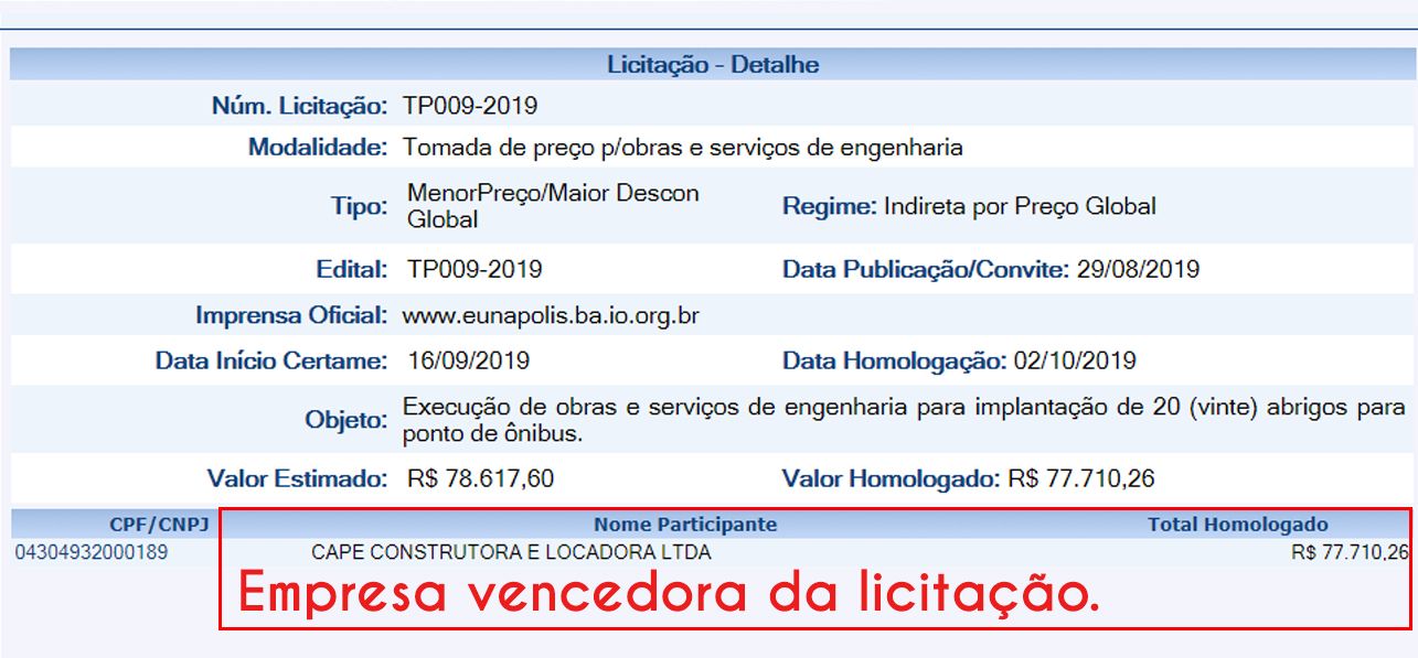A farra das licitações na prefeitura de Eunápolis continua, desta vez foi a homologação no dia 02/10/2019, para a construção de 20 abrigos de pontos de ônibus com valor de R$ 77.710,26, cada abrigo custará R$3.885,51 (três mil, oitocentos e oitenta e cinco reais, cinquenta e um centavos).