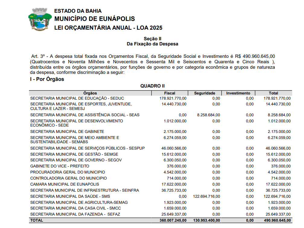 Projeto de Lei do Orçamento Municipal para 2025 chega à Câmara de vereadores de Eunápolis