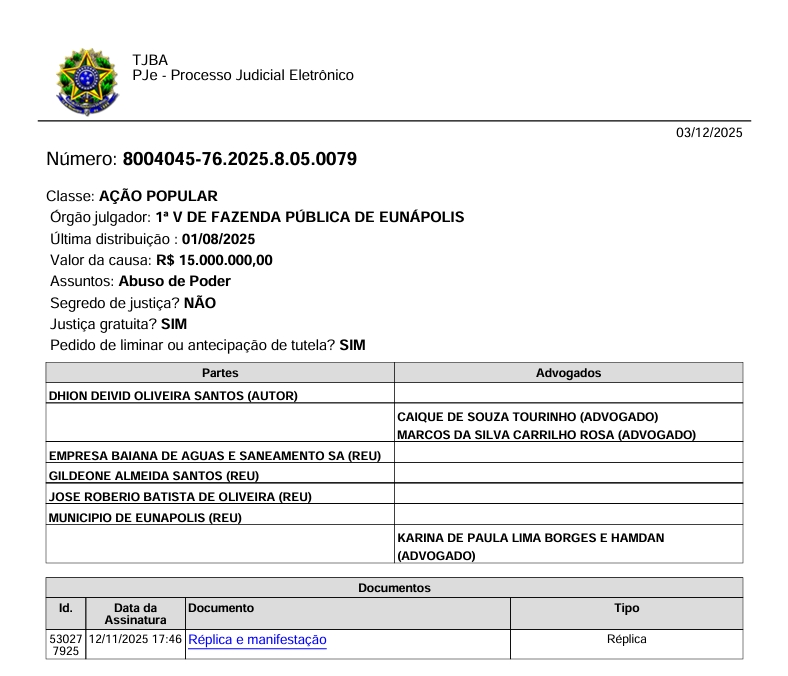 Uma ação popular movida por um cidadão de Eunápolis contesta na Justiça o Termo Aditivo assinado em 10 de junho de 2025 entre o prefeito José Robério Batista de Oliveira e a Embasa. O documento prorrogou a concessão dos serviços por mais 27 anos e estabeleceu uma “contribuição” de R$ 15 milhões para o Município.