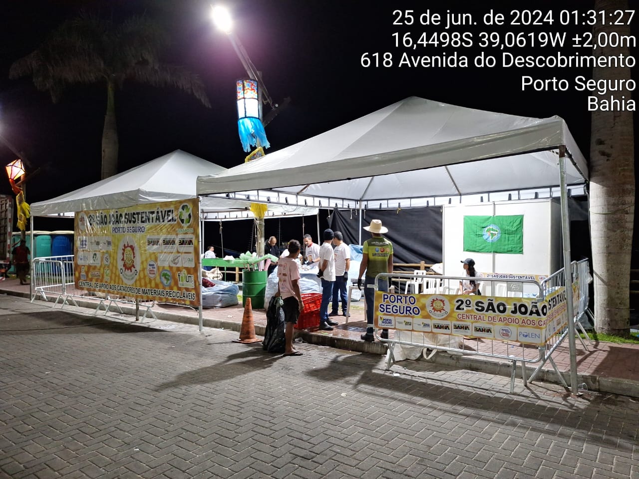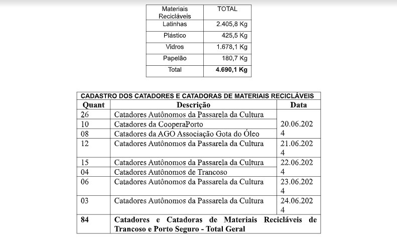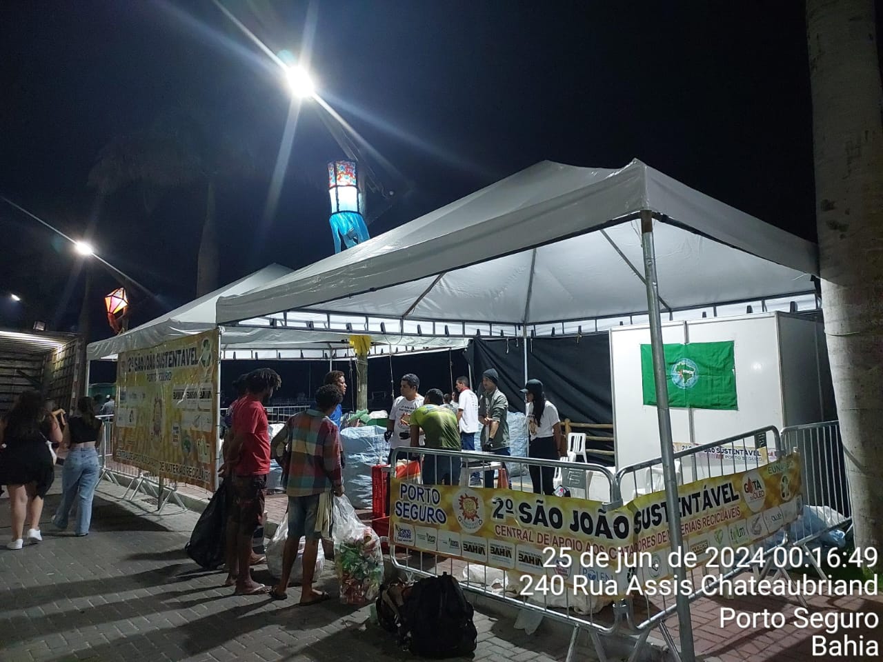 Quase 5 mil quilos de materiais recicláveis dentre eles papelões, plásticos, garrafas de vidros e latinhas de alumínio foram coletados em Trancoso e na Passarela da Cultura em Porto Seguro no 2º São João Sustentável dos dias 20 a 24 de junho de 2024 por 84 catadores e catadoras de materiais recicláveis da CooperaPorto, Ago Associação Gotado Óleo e catadores autônomos que foram cadastrados para a realização da coleta seletiva dos recicláveis no circuito das festas juninas.