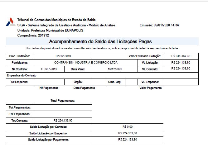 O contrato firmado entre a prefeitura e a empresa é de R$ 224.133,90, com validade a partir do dia 19/12/2019 á 15/12/2020.