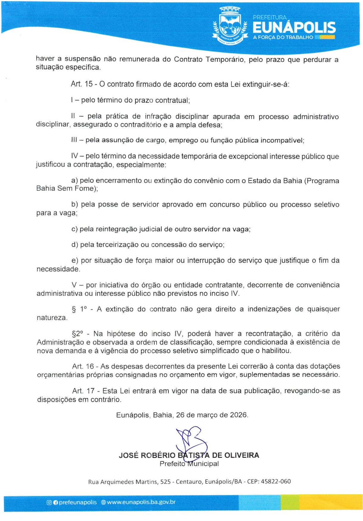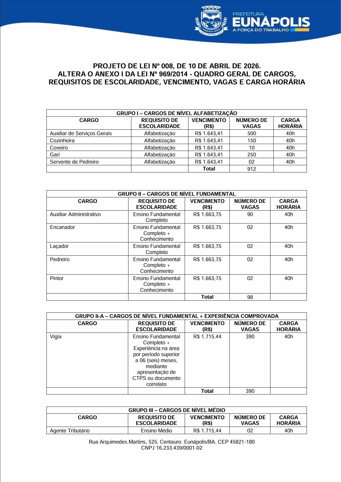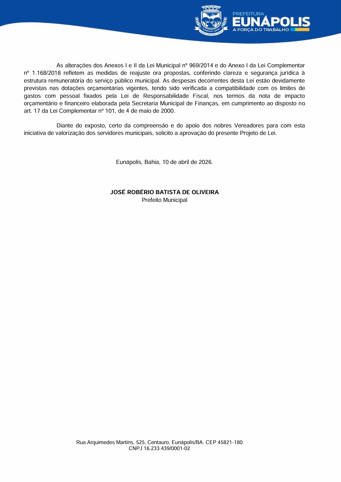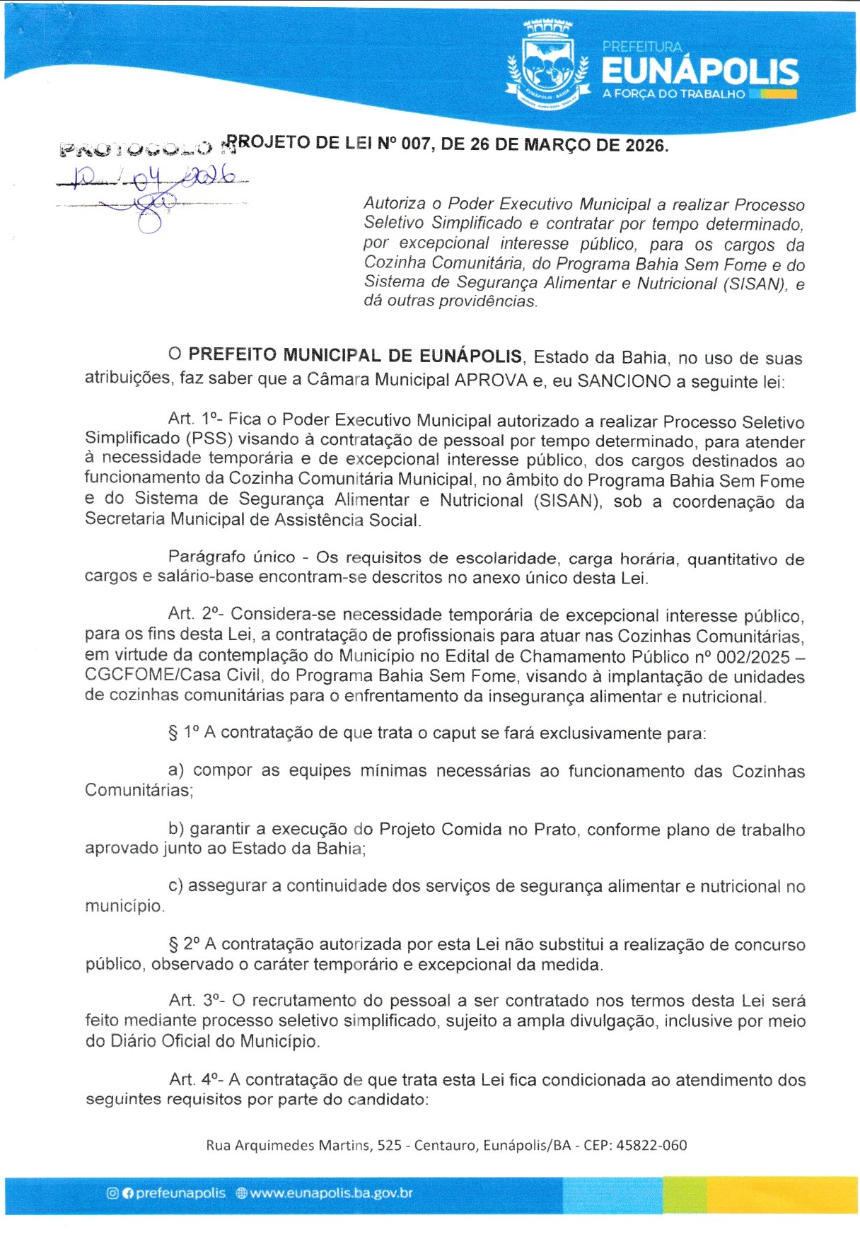 O prefeito de Eunápolis, Robério Oliveira, encaminhou à Câmara dois projetos de lei que mexem diretamente com a estrutura do funcionalismo municipal. No Projeto de Lei nº 007, o Executivo pede autorização para realizar processo seletivo simplificado e contratar 15 profissionais temporários para atuação na Cozinha Comunitária, dentro do Programa Bahia Sem Fome e do SISAN: 8 auxiliares de serviços gerais, 4 cozinheiras e 3 nutricionistas.