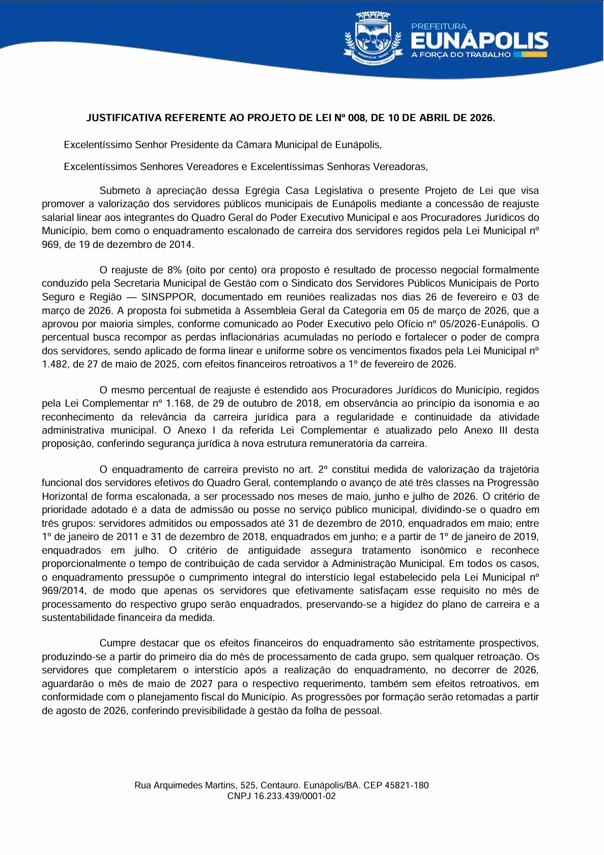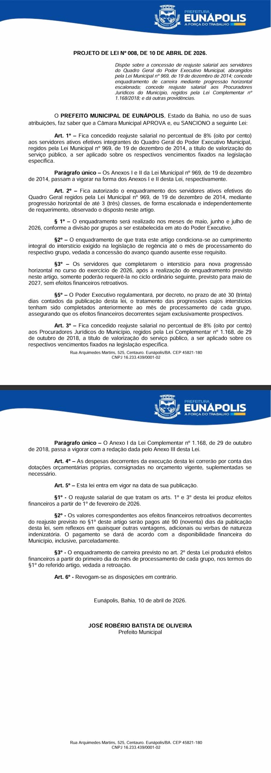 Mas o projeto de maior alcance é o de nº 008. Nele, a Prefeitura propõe reajuste salarial de 8% para os servidores efetivos do Quadro Geral do Poder Executivo e também para os procuradores jurídicos do município, além de progressão horizontal de até três classes, com implantação escalonada entre maio e julho. O texto ainda prevê efeitos financeiros retroativos a 1º de fevereiro de 2026, com pagamento em até 90 dias, inclusive de forma parcelada.