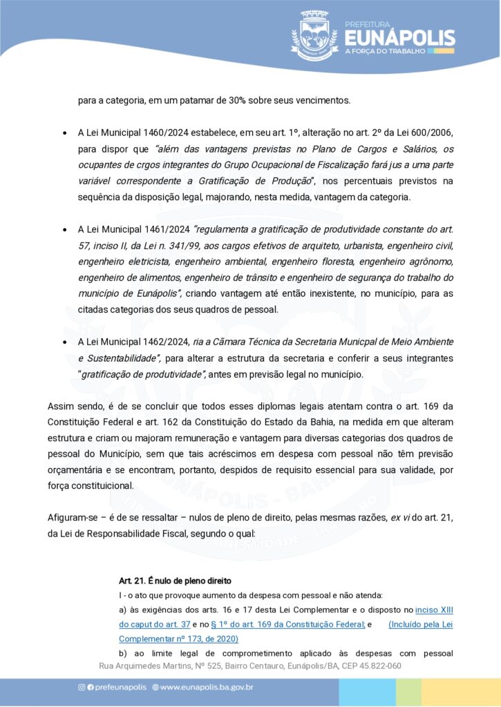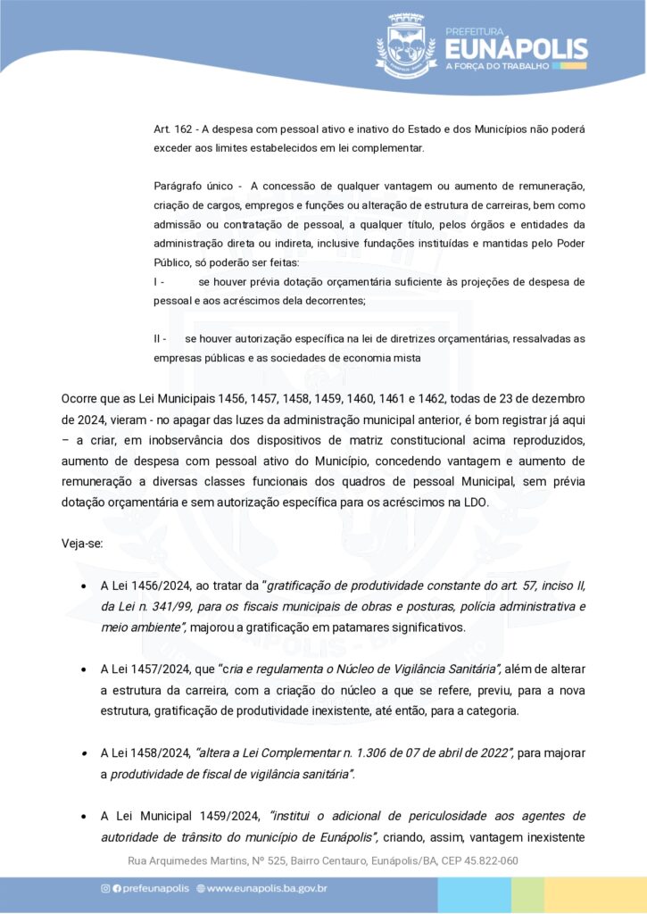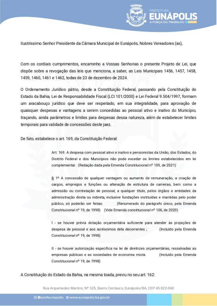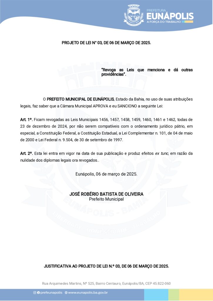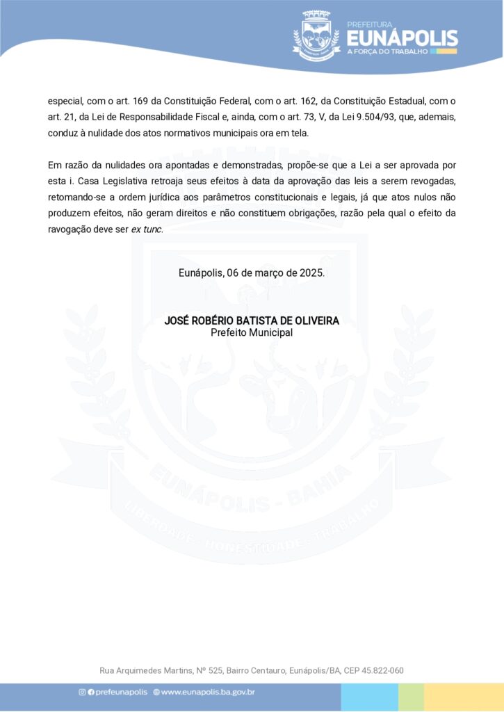O prefeito Robério Oliveira (PSD) começou seu quarto mandato à frente da prefeitura de Eunápolis, na Bahia, reacendendo antigas disputas com os funcionários públicos municipais. Na quinta-feira, 6 de março, ele enviou à Câmara Municipal o Projeto de Lei nº 03/2025, que revoga sete leis aprovadas em 23 de dezembro de 2024, durante a gestão da ex-prefeita Cordélia Torres (UB). A medida elimina benefícios concedidos a servidores de diversos setores da administração pública, gerando um clima de insatisfação logo no início de sua gestão.