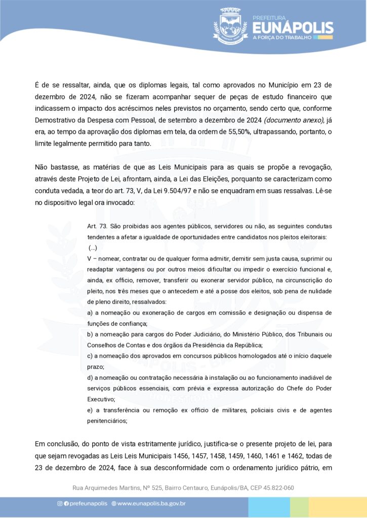 O projeto, intitulado “Revoga as Leis que menciona e dá outras providências”, extingue as Leis Municipais nº 1456, 1457, 1458, 1459, 1460, 1461 e 1462. Segundo o texto, essas legislações foram consideradas incompatíveis com o ordenamento jurídico nacional, incluindo a Constituição Federal, a Constituição Estadual, a Lei Complementar nº 101/2000 (Lei de Responsabilidade Fiscal) e a Lei Federal nº 9.504/1997. A revogação entra em vigor na data de sua publicação, com efeitos retroativos, anulando os direitos previamente estabelecidos para os funcionários públicos.