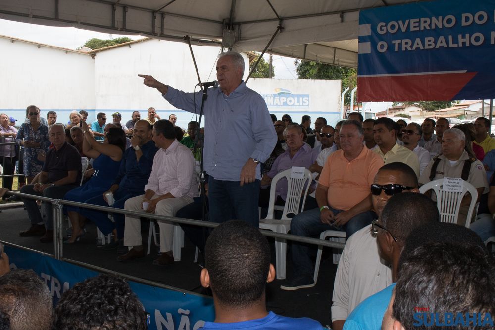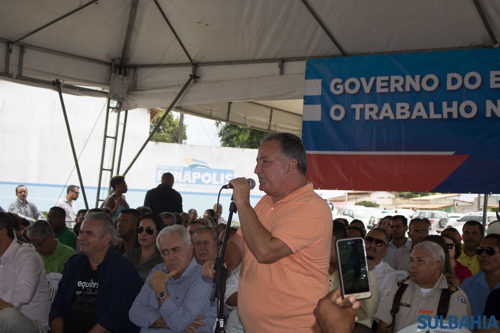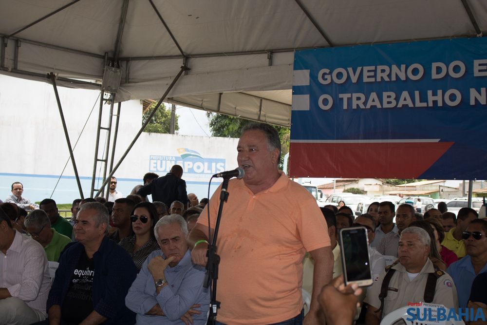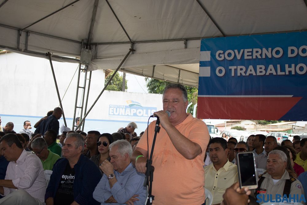 Eu quero aqui inicialmente fala do compromisso de quando estevemos aqui na Colônia e anunciamos a construção da estrada, fomos fazer o projeto, segundo Rui costa conseguiu o empréstimo o dinheiro, mas que na Bahia tem algumas pessoas que apesar de serem baianos tem a cabeça velha antiga, apesar de alguns terem cabelos preto mas as ideias são muito antigas daquele tempo que o politico achava que iria se dar bem maltratando a população, humilhando a população, fazer a população sofrer como se quisesse exercer a liderança no chicote maltratando o povo e por isso eles tentaram impedir que a Bahia conseguisse empréstimo pra fazer as estradas da Bahia, nós assinamos o contrato e no dia de fazer o depósito esse Presidente da República que é rejeitado pela maior parte dos brasileiros ouviu o pedido de alguns que são políticos pedindo que não emprestasse o dinheiro, porque se não o estado iria fazer as estradas, mas as estradas não é pra o Governador, as estradas e para o povo utilizar, porque eles achavam que se impedisse o Governador de fazer estradas eles podia se dar bem no próximo pleito eleitoral disse Rui costa, fazendo referencias as tentativas de políticos da oposição que tentaram bloquear recursos federais por meio de empréstimos direcionados para a a Bahia, ao final Rui Costa agradeceu a população e garantiu que mais investimentos virão para Eunápolis por meio do Governo do estado.