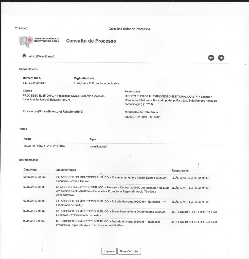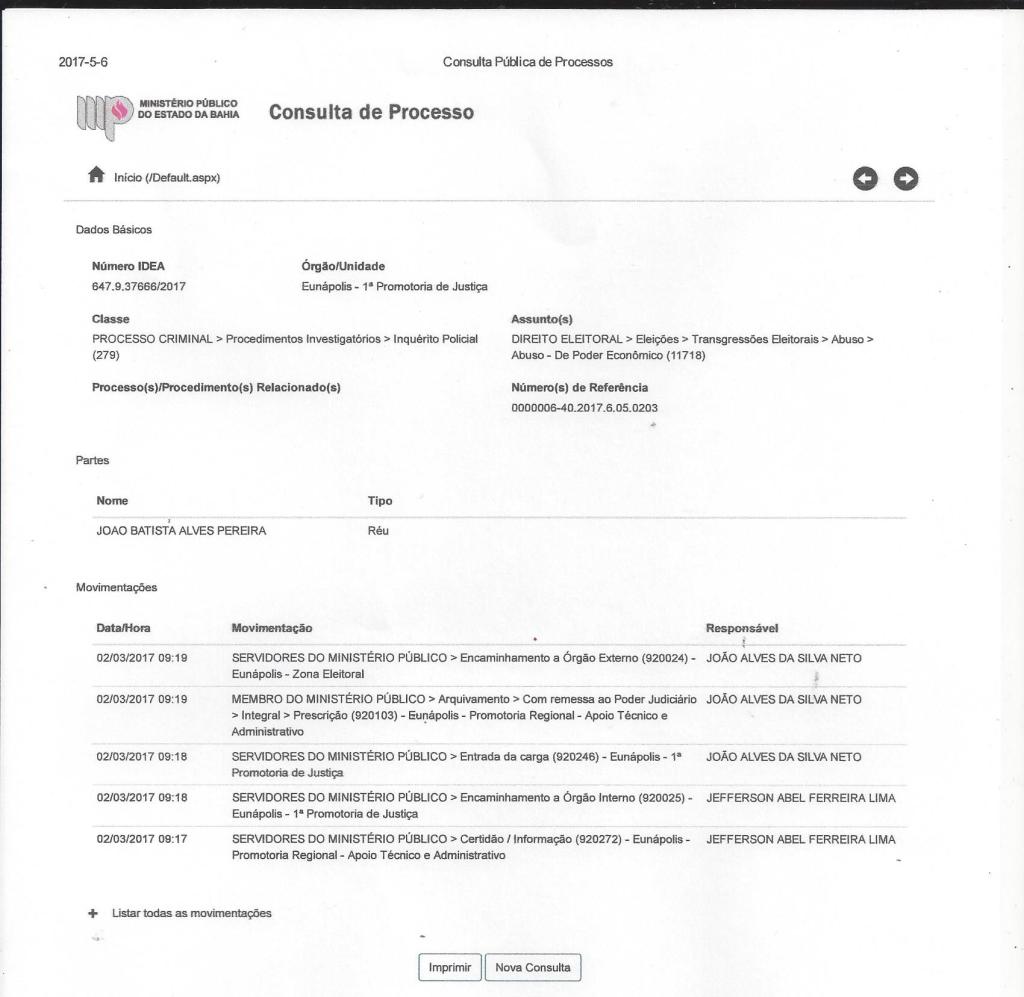 A Promotoria pública do Estado da Bahia estar investigando por meio da 1ª Promotoria de Justiça de Eunápolis o Vereador e Advogado João Batista Alves Pereira, na condição de Réu, o processo em curso é a respeito de Transgressões – Eleitorais – Abuso – De Poder Econômico. O Brasil passa um momento de anseio de justiça onde a sociedade no geral não aguenta mais com tantos abusos em várias áreas da administração publica e principalmente pelos abusos do políticos, em Eunápolis não é diferença o Réu em questão tem varias investigações em curso por varias praticas de supostos crimes cometidos, entre eles que segundo a promotoria pública em Eunápolis foi formado um grupo por meio do vereador no intuito de toma posse de áreas publicas por meio de invasões onde o principal plano era captar pessoas na promessa que ganharia terrenos públicos mas que em troca teria que favorecer o vereador por meio de votos visando se reeleger novamente vereador.