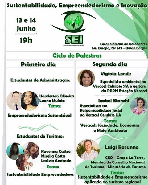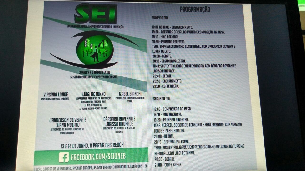 Será realizado nos dias 13 e 14 de junho de 2017, a partir das 19h, na Câmara de Vereadores de Eunápolis, Bahia, localizada na Avenida Europa, 549, bairro Dinah Borges, o evento SEI – Sustentabilidade, Empreendedorismo e Inovação, com entrada gratuita e direito a certificado, organizado por alunos das turmas de Administração e a de Turismo da Universidade do Estado da Bahia (UNEB) – Campus XVIII com o título: Conheça a dinâmica entre sustentabilidade e empreendedorismo.