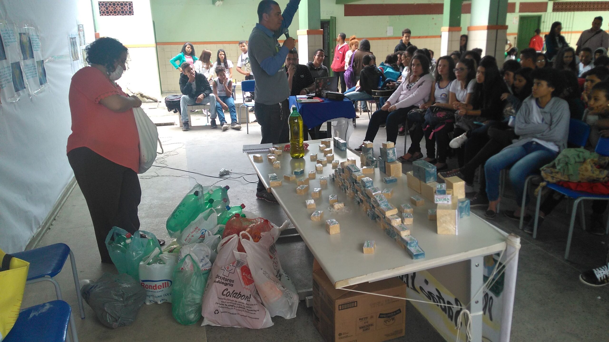 Foi feita a troca do sabão pelo óleo de cozinha usado e a doação de garrafas pet feito por funcionários da escola e alunos.