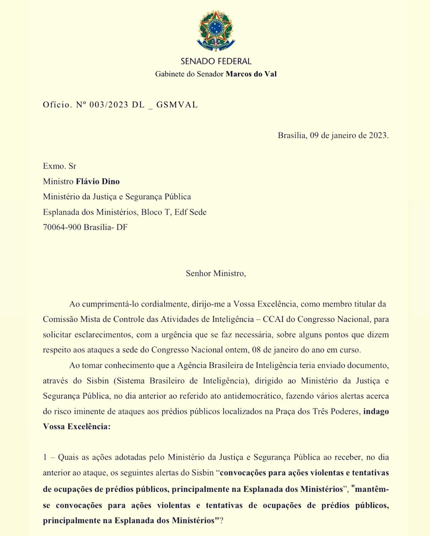 Em sua publicação o Senador afirma que Flávio Dino teria sido informado por meio do Sistema Brasileiro de Inteligência (SISBIN), onde teria encaminhado ao Ministério da Justiça e Segurança Pública, no dia anterior ao do referido ato antidemocrático, fazendo vários alertas acerca do risco iminente de ataques aos prédios públicos localizados na Praça dos Três Poderes.