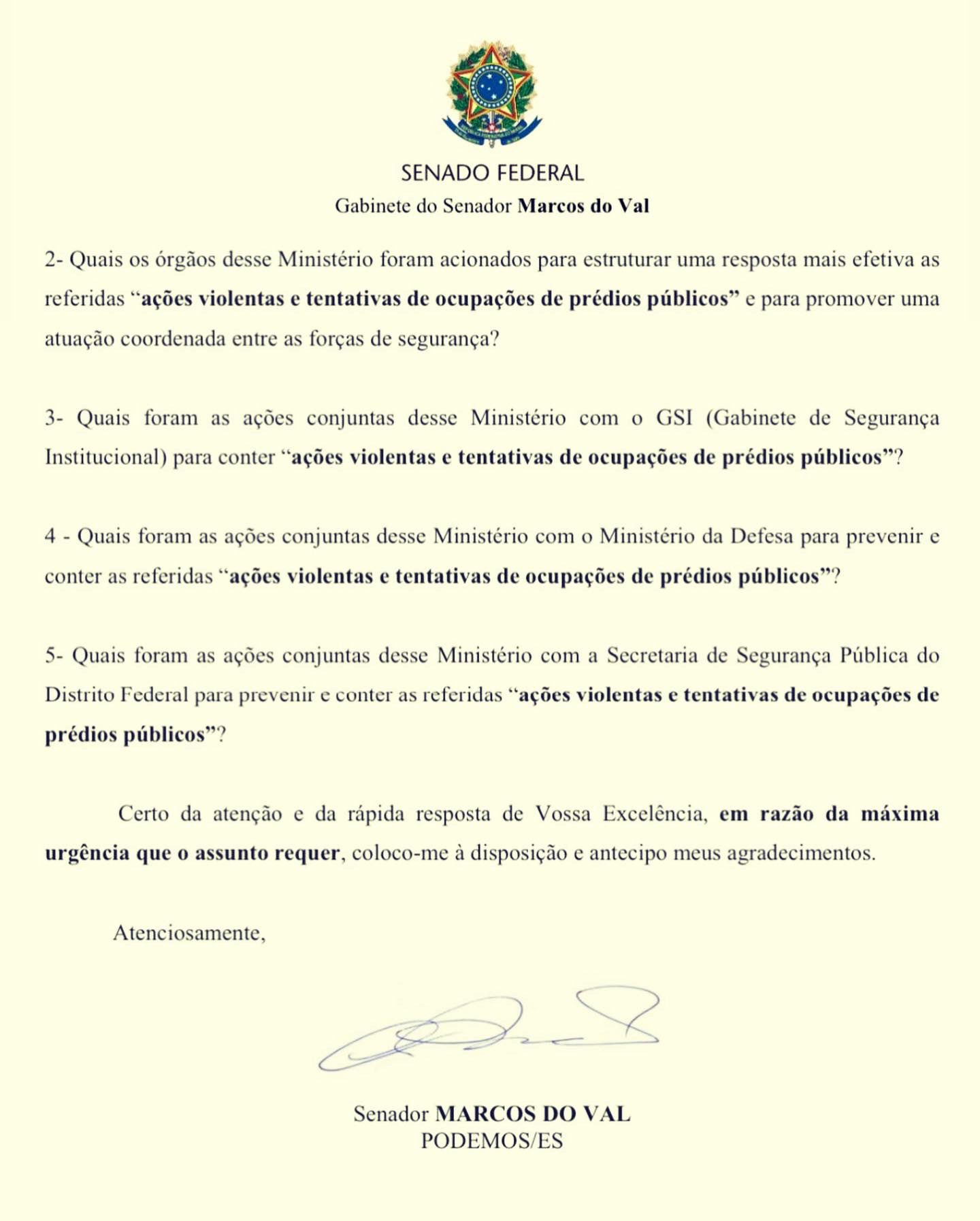 Senador Marcos do Val (PODEMOS), divulgou um Ofício em sua rede social nesta segunda-feira (09), com pedido de esclarecimentos do Ministro da Justiça, Flávio Dino.