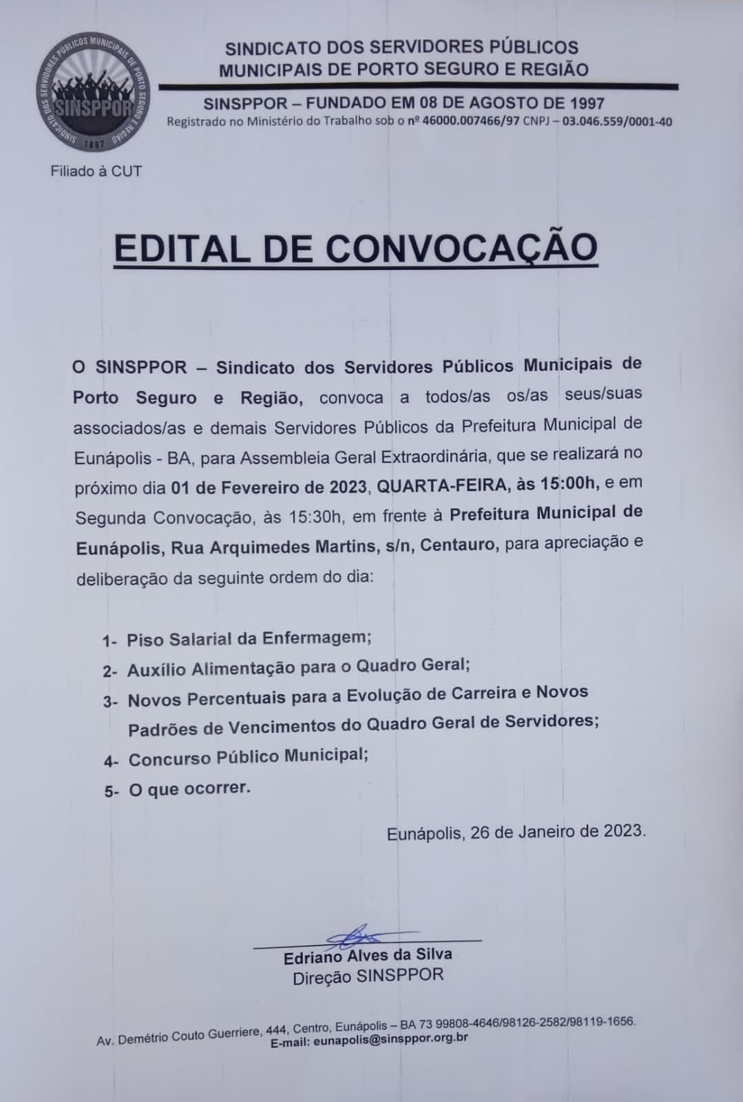 O Sindicato dos Servidores Públicos Municipais de Porto Seguro e Região (SINSPPOR), convoca todos os associados e demais Servidores Públicos da Prefeitura de Eunápolis, para Assembleia Extraordinária, que será realizará no dia 01 de fevereiro, quarta-feira às 15:00hs e em Segunda Convocação, às 15:30hs, em frente a Prefeitura Municipal de Eunápolis, Rua Arquimedes Martins, s/n, Centauro, para apreciação e deliberação da seguinte ordem do dia: